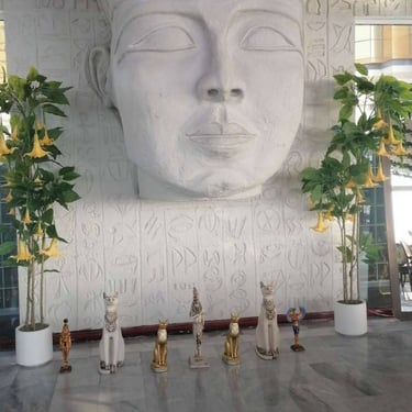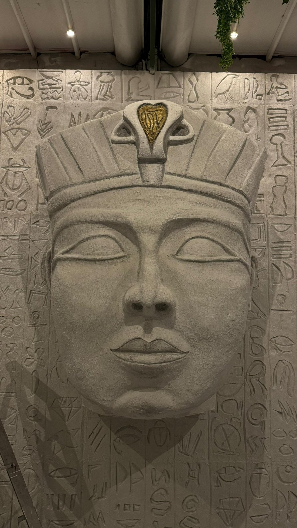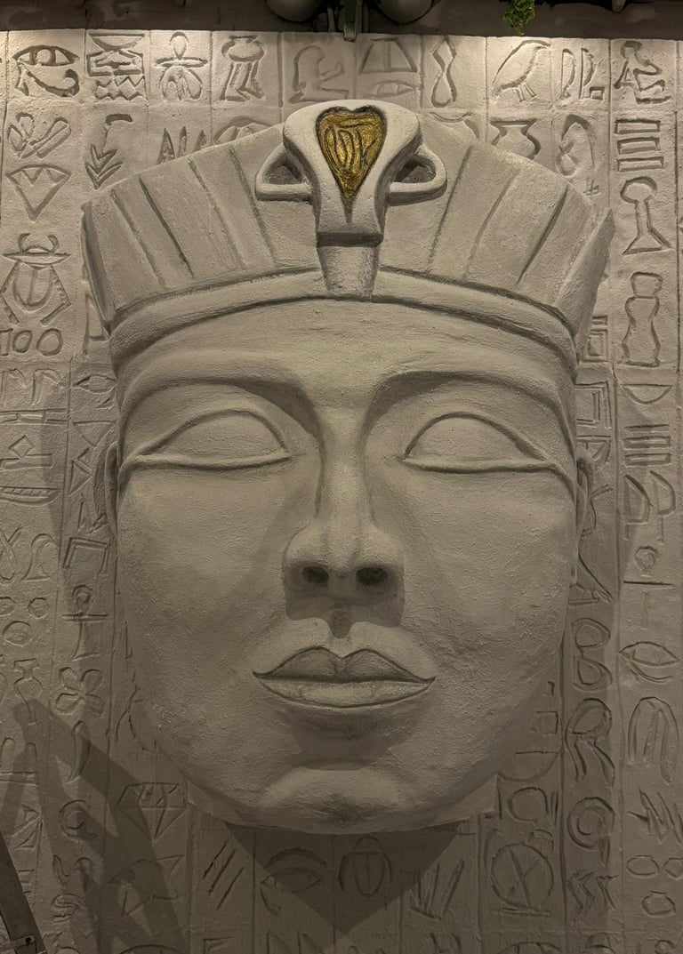 تم تنفيذ أكبر منحوتة فرعونية داخل مطعم في المملكة العربية السعودية، بحجم إجمالي يقارب 4 أمتار مربعة وارتفاع مترين، صُمّمت كمجسم جداري ضخم معلّق يمنح المكان حضورًا بصريًا مهيبًا.
