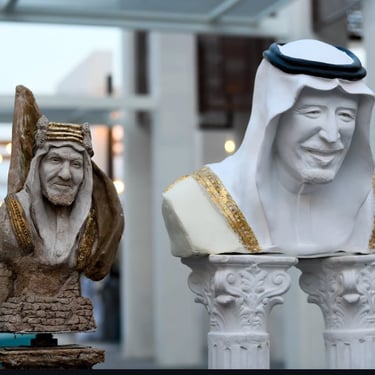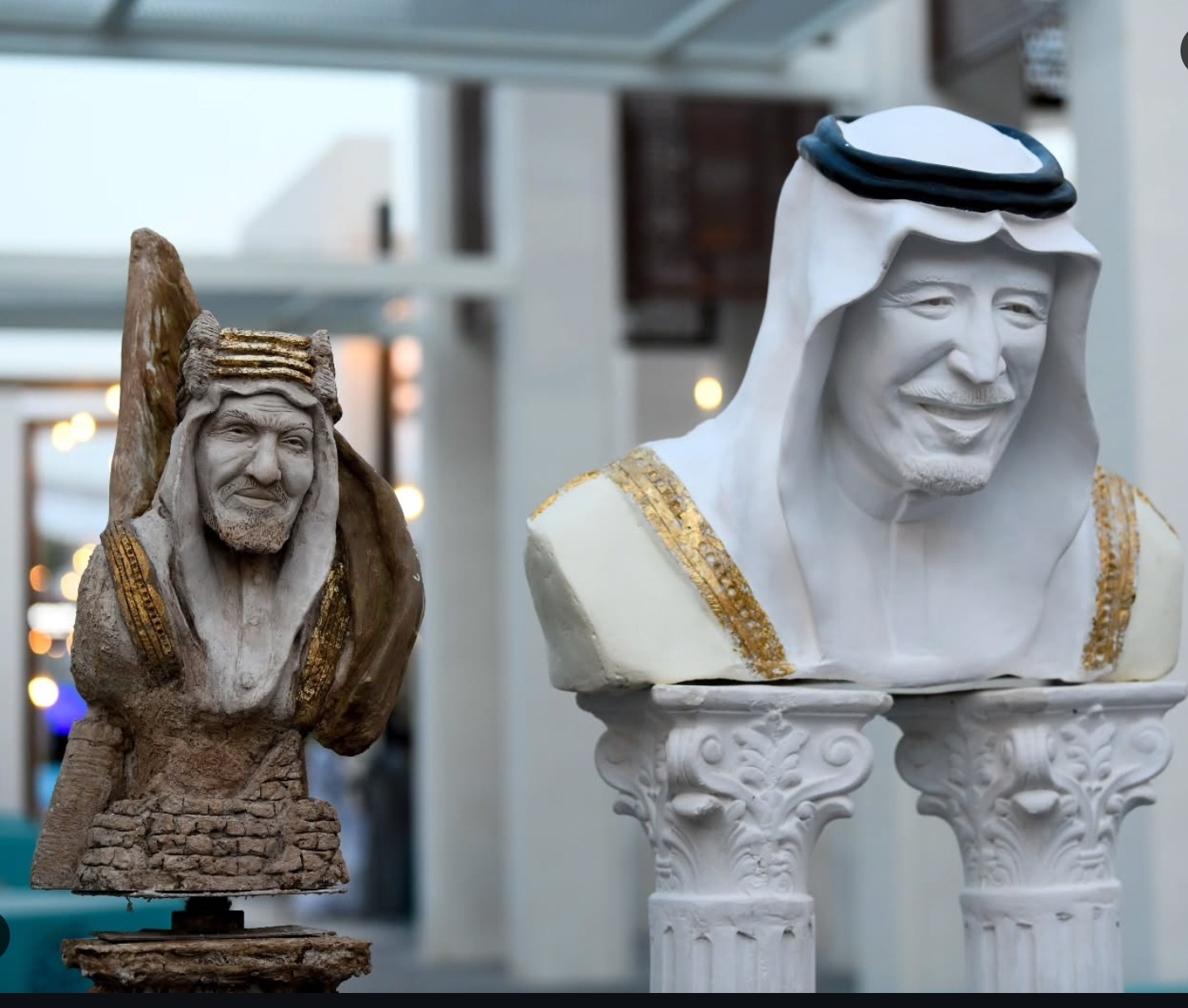 أما قاعدة المنحوتة فتحتضن ملامح شموخ حي الطريف في الدرعية، مع حضور قلاع قصر المصمك في الخلفية، لتكتمل سردية العمل بين التأسيس، والمجد، والهوية الوطنية المتجذرة.