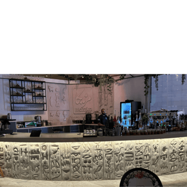 كما شمل المشروع نحت جداريات المطعم بالكامل بأسلوب فرعوني من خلال النحت الغائر للحروفيات والرموز التاريخية، لتتحول الجدران إلى سرد بصري يحاكي الحضارة المصرية القديمة بتفاصيلها الدقيقة.