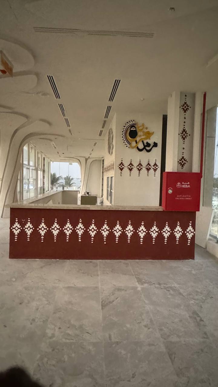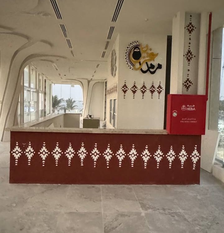 تم تنفيذ نحت جداريات المطعم بأسلوب زخرفي تراثي مستوحى من تصميم العميل، تمثّل في نخلة تجريدية امتدت على الجدران والأعمدة، لتوحّد العناصر المعمارية ضمن قصة فنية واحدة.