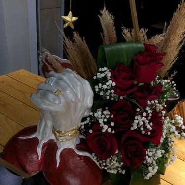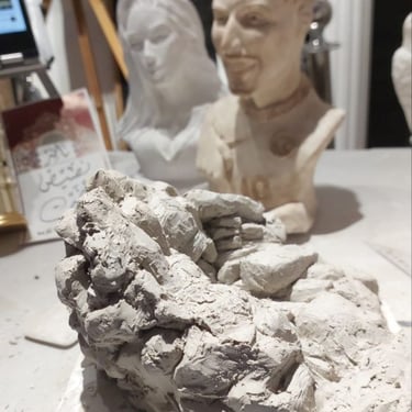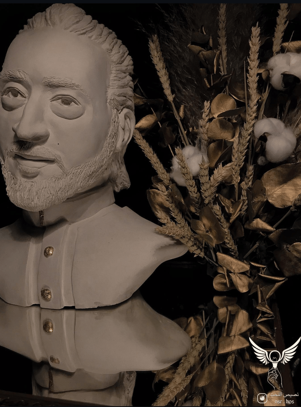 وتحت المنحوتة، توضع باقة ورد حقيقية… كأن الأنف يستنشق شذاها.