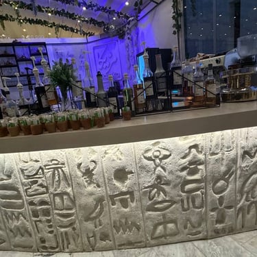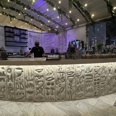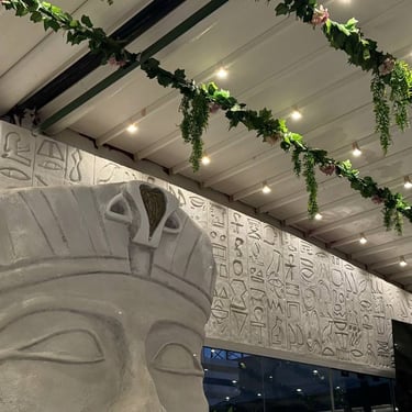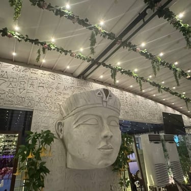 النتيجة؟تجربة بصرية غامرة تشعرك وكأنك تتناول عشاءك داخل إحدى أروقة الأهرامات المصرية، حيث يمتزج الضوء بالظل فوق النقوش، ويتحول المكان من مطعم إلى رحلة عبر الزمن.