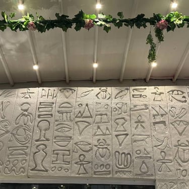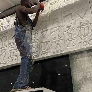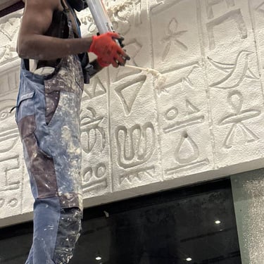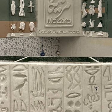 لم يتوقف العمل عند المنحوتة الرئيسية، بل امتد ليشمل نحتًا غائرًا كاملًا لجداريات المطعم بأسلوب فرعوني أصيل، يتضمن الحروفيات والرموز والنقوش المستوحاة من المعابد والأهرامات.